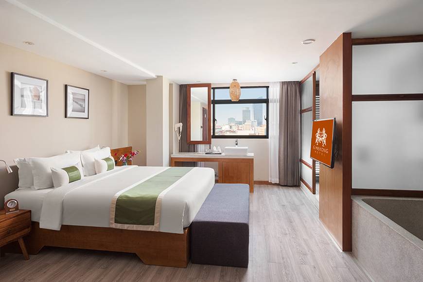at Monivong Clover Hotel combines modern comfort with a touch of luxury, ideal for couples or guests seeking extra relaxation. This spacious room features a plush king-size bed, a private bathroom with a bathtub, and elegant interiors designed for comfort and convenience.